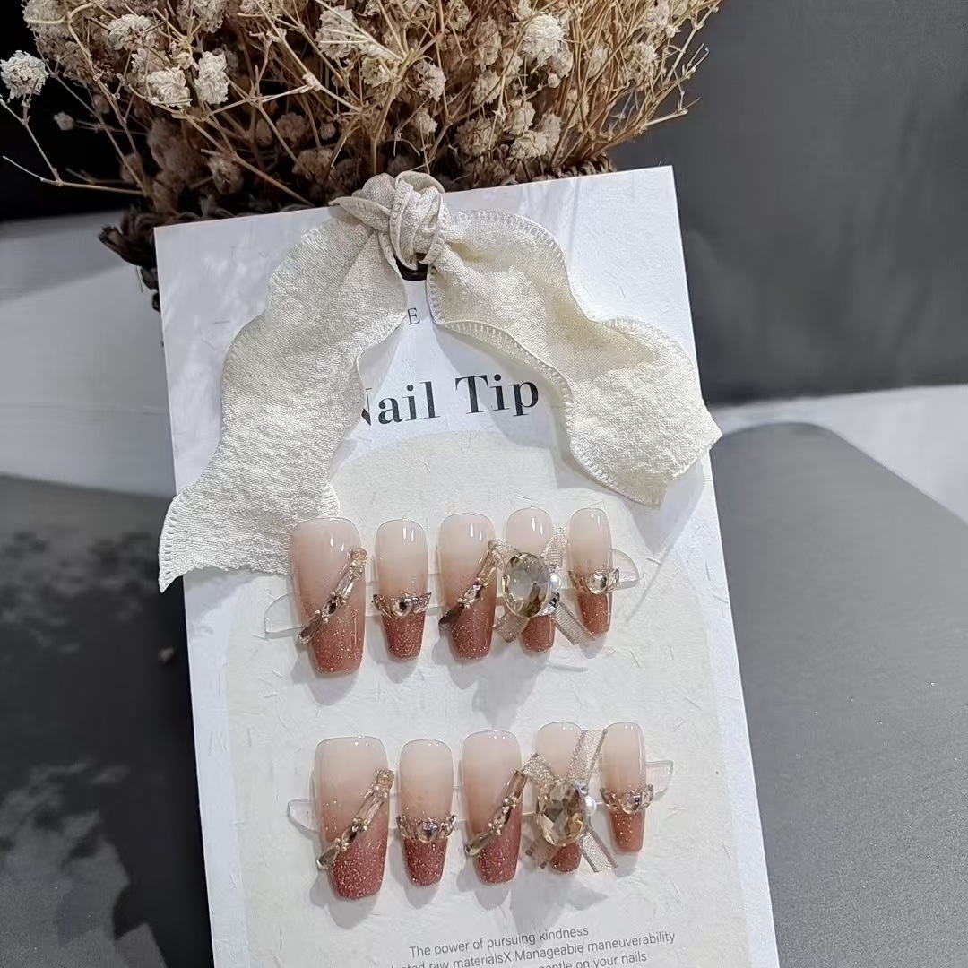 Nude gradient nails with sparkling crystals, golden accents, and a statement ribbon jewel for an elegant, glamorous look. ✨