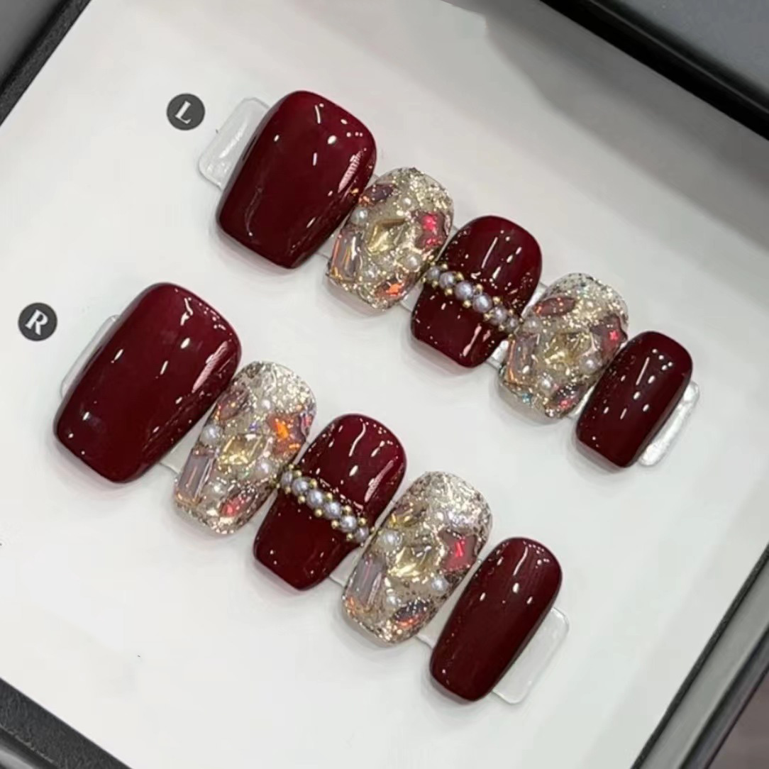 Deep burgundy nails paired with glittering crystals and pearl accents for a glamorous, festive look. ✨