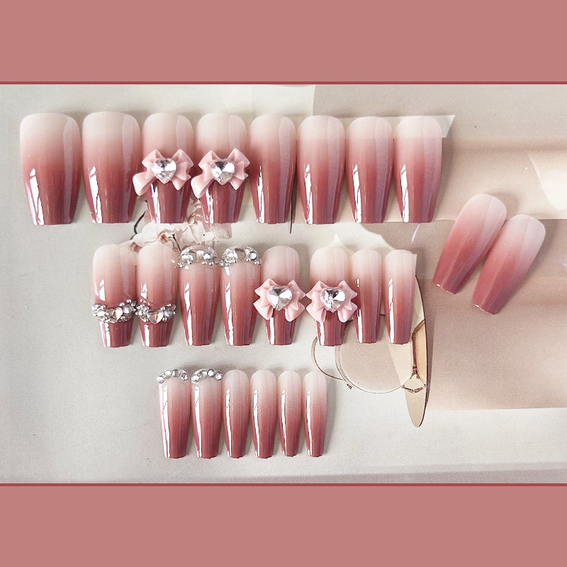 Gradient pink nails adorned with crystal-studded bows and silver gems for a sweet yet glamorous look. 💖