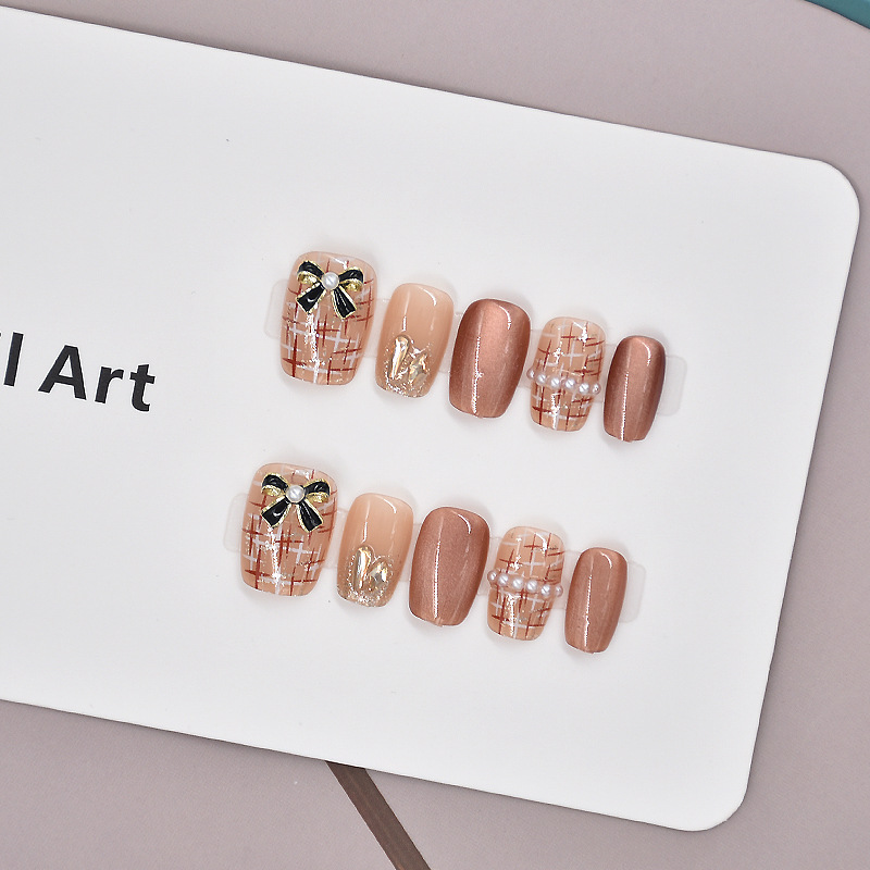 Warm nude-brown nails with plaid design, pearls, and ribbon accents for a chic and classy look. ✨